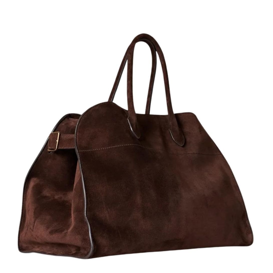 The Row Soft Margaux 15 bag in suede is a statement piece that seamlessly blends luxury with understated elegance. This bag is an epitome of refined craftsmanship, featuring a soft, supple suede exterior that exudes a sense of sophistication. The material choice not only adds a tactile element of luxury but also imbues the bag with a rich, matte finish that subtly enhances its visual appeal.